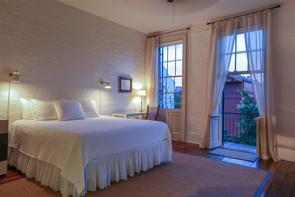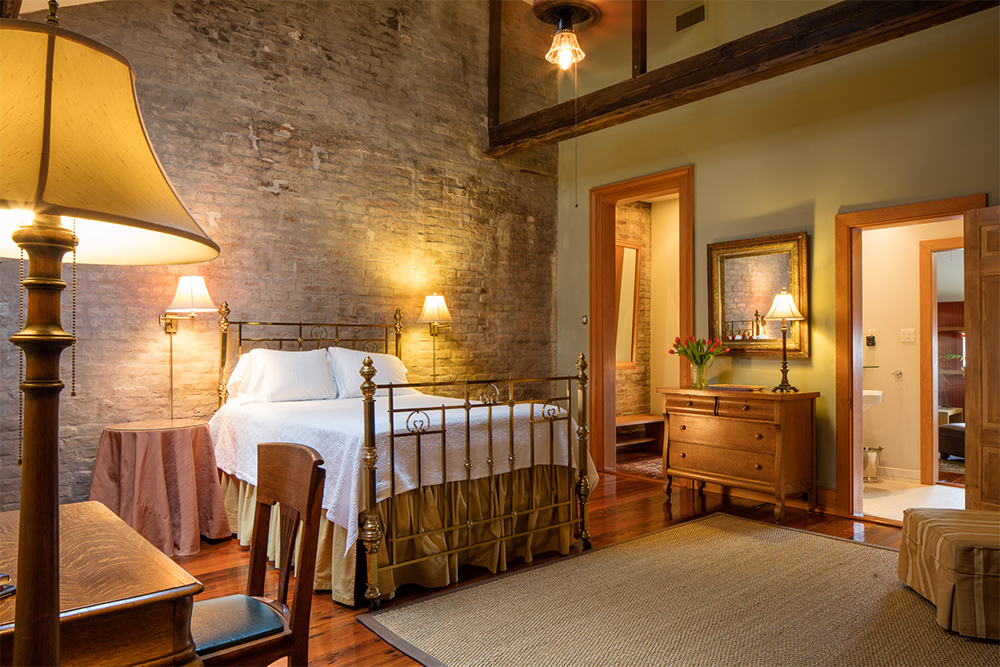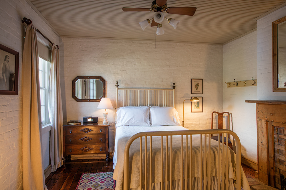 This two room suite on the second floor of the slave quarters overlooks the courtyard. With an antique double iron bed, the bedroom leads to a sitting room that includes a private bath with shower. It has self-controlled central air and heat, as well as wifi. >> Additional Information About this Room