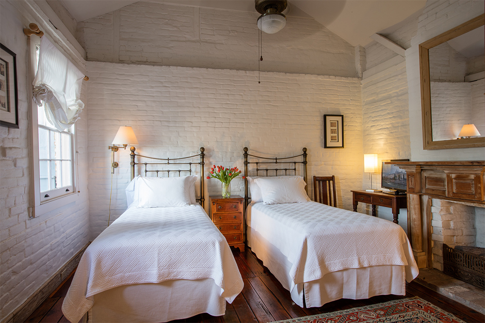 This cozy two room suite on the third floor of the slave quarters overlooks the courtyard. The bedroom has vaulted ceilings with skylights, and two twin beds that can be converted into a king. Connecting to a sitting room, the space includes a private bath with shower, self-controlled central air and heat, as well as wifi. >> Additional Information About this Room